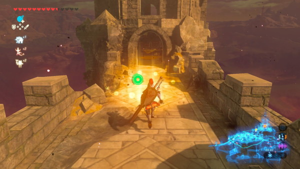 Sitúate en la zona central y date la vuelta arriba a la izquierda verás un saliente en el que hay un cofre y solo debes esperar a que el bloque central caiga para ser impulsado y usa la paravela para llegar hasta él. Al llegar a Kakariko y hablar con Impa activarás la misión Recuerdos en imágenes y en la piedra sheikah en el albúm de fotos tendrás las 12 fotografías que te sirven como pista para encontrar los recuerdos perdidos. O entrad coged el recuerdo y salid del lugar como alma que lleva el diablo.